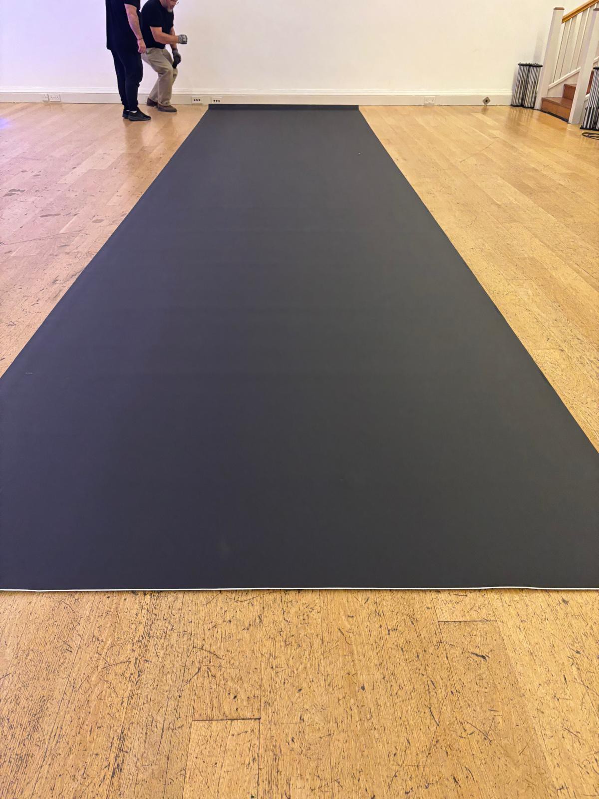 We are a small arts charity based in London. We hosted a performance on 16 and 17 October (last week) and for the needs of the solo performance we had to buy 4 rolls of this black dance & event flooring. Each roll is 2 x 8 meters. One roll was shortened by one meter so it is a 2 x 7 meter roll now but we still have the off cuts.In the pictures, it is the black floor laid on the floor (not the white roll that is used as a background on the trusses, although this is for sale too). We used the floor for 4 hours in total. Two hours of rehearsals and two hours of a performance by one solo dancer so with a quick cleaning or moping this will be as brand new.