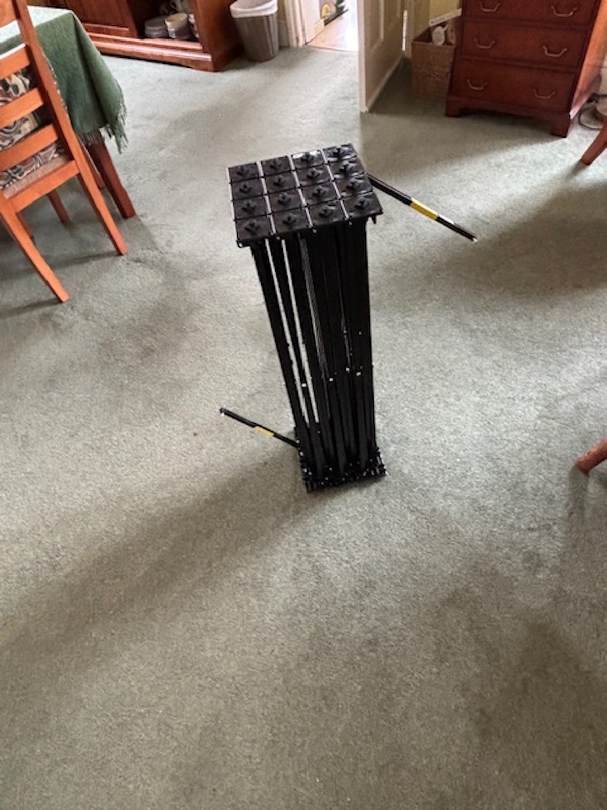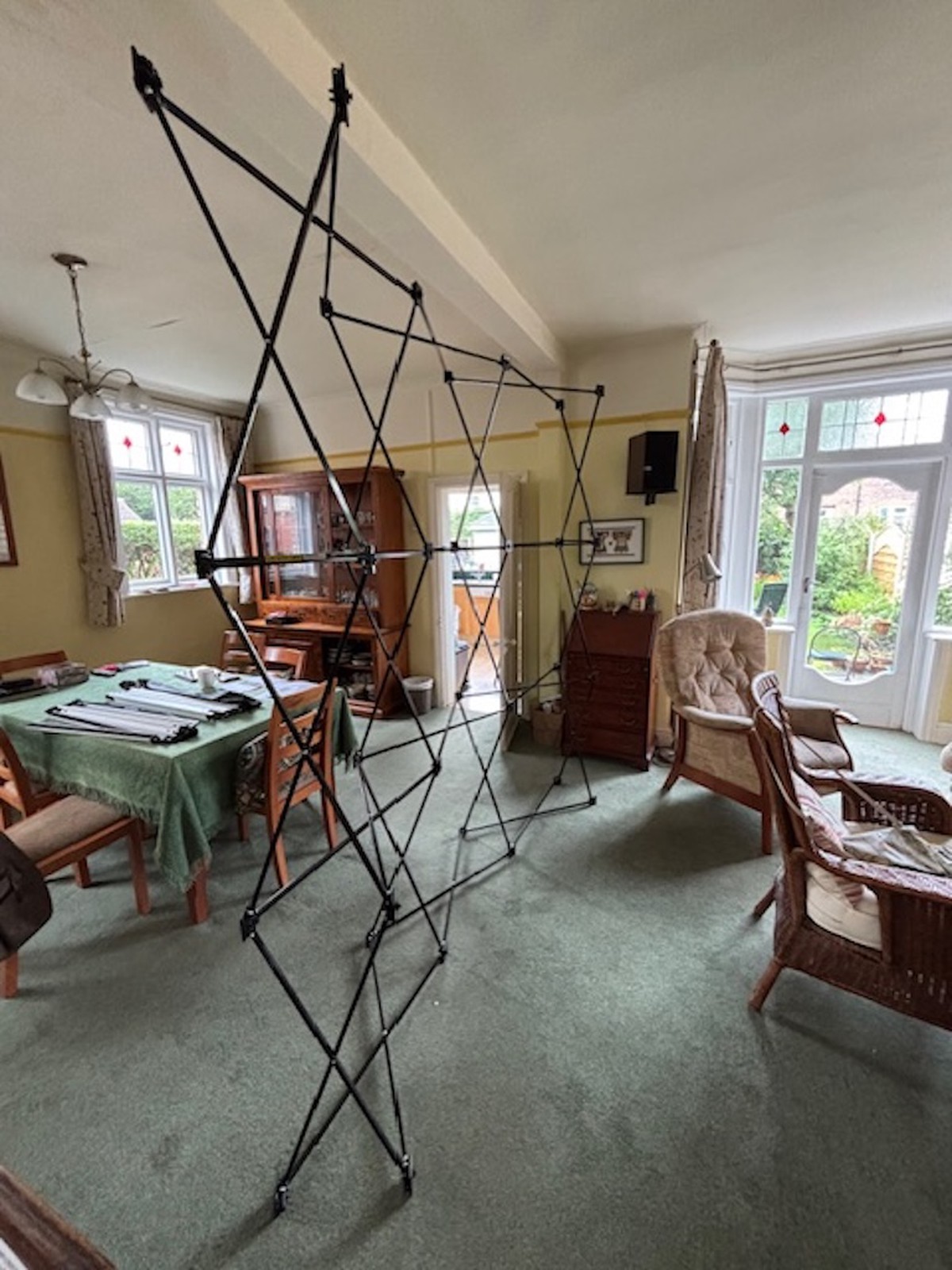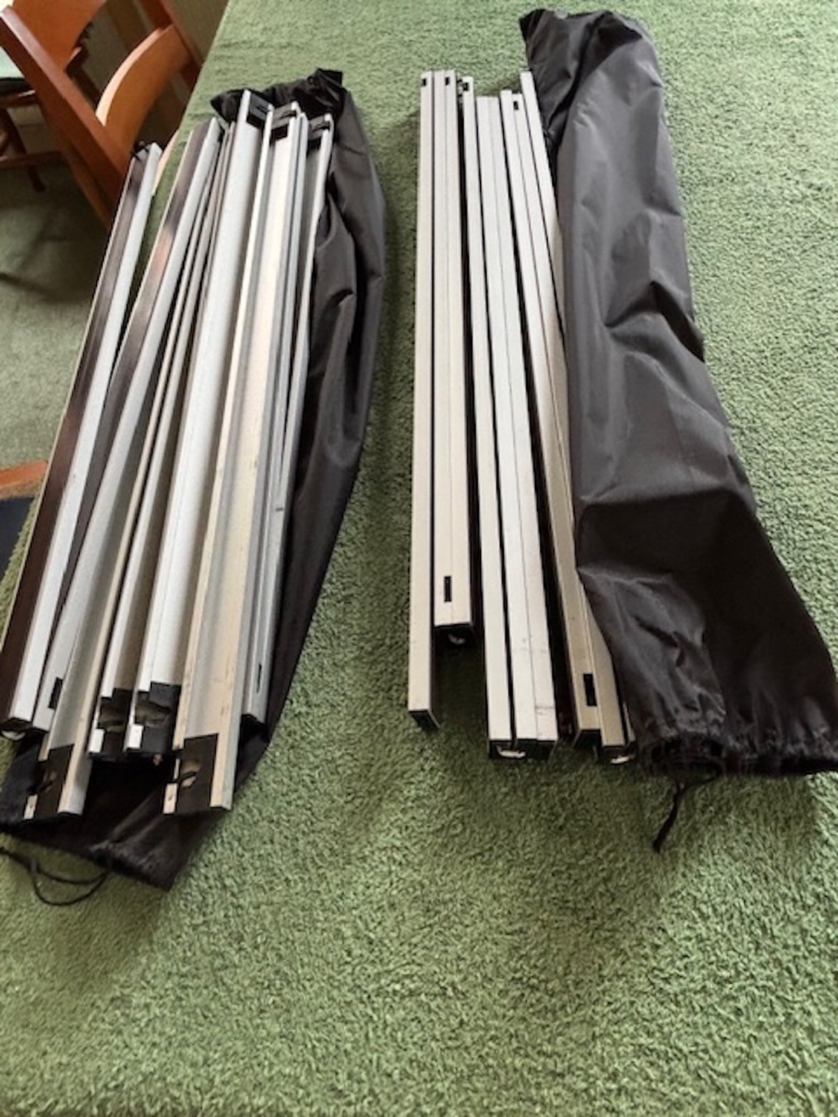 3x3 curved pop up (concertina – pull out metal frame) approx. 2.2m tall x 2.5m wide.
